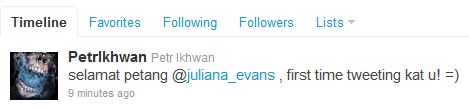 Dalam dok syoq2 aku dok berTwitter tiba-tiba aku terfollow seorang awek bernama Juliana Evans. Lantas tanpa melengahkan masa lagi, aku pon perayaq beliau dengan ayat2 cinta Venomancer yang begitu lazat sekali. Pikiaq2, try pi la..Mana taw, kot2 kali ini umpan aku mengena. Sebabnya sebelum ini, dalam banyak2 awek yang aku perayaq semua buat dek kat aku. Tak reply pon. Maklumlah, kata depa banyak sangat tweet dari peminat. Tak sempat nak reply. Namun aku sangat bertuah kali nie..huk2 *gembira! Apabila........